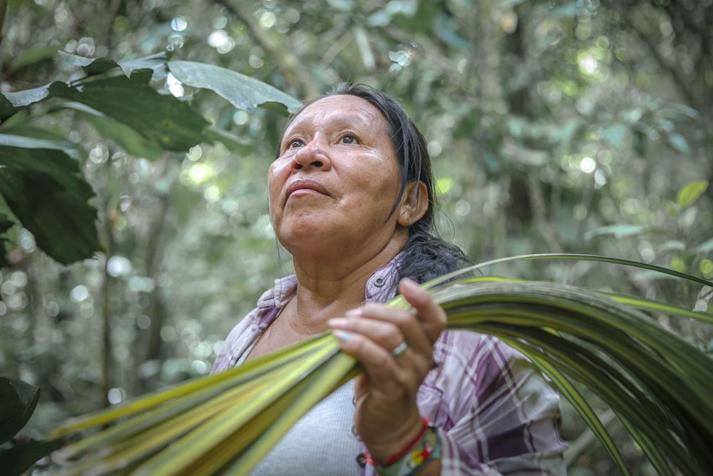 “No es fácil buscar tamshi. Ya no se encuentra tan rápido como antes. A veces caminamos un día entero para hallarlo, o vamos a otras zonas del bosque para tener más posibilidades”, explica Teófila Saavedra, presidenta de la Asociación de Artesanas Shi’Oi.