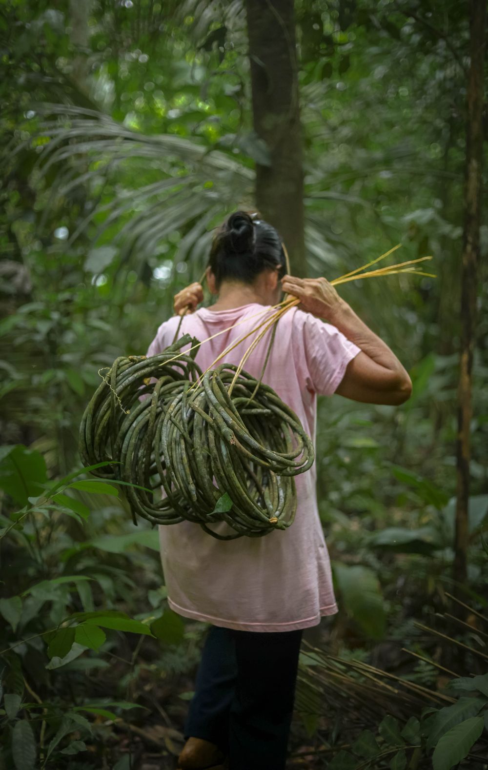 Tras varias horas de caminata, llegan a una zona de árboles frondosos donde cuelgan largas lianas de tamshi. Las tres mujeres, Teófila, Jesusa y Domilda, se juntan para jalar suavemente la liana y luego cortarla de manera sostenible “para que vuelva a crecer pronto”, como dice una de ellas. El manejo sostenible implica seleccionar lianas maduras de al menos 1,5 metros, cortar las partes secas y dejar intactas las plantas jóvenes, lo cual permite la regeneración del bosque.